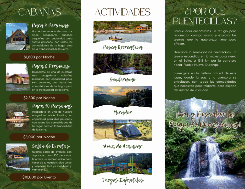 Las actividades son cuantiosas y solo tu imaginación es el límite de como te puedes divertir; caminando, pedaleando en tu bicicleta de montaña por las veredas del bosque o sólo observando la naturaleza, dejando que tu mente corra con el viento gozando de un gran día en uno de los sitios sublimes de la Sierra Madre Occidental, el paraje de Puentecillas.