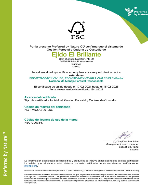 ha sido evaluado y certificado cumpliendo los requerimientos de los estándares FSC-STD-50-001 V2-1 ES; FSC-STD-MEX-02-2021 V2-0 ES El Estándar Nacional de Manejo Forestal Responsable, el cual es válido desde el 17/02/2021 hasta el 16/02/2026, el Código del certificado es NC/FM/COC-001256 y código de licencia de uso de marca FSC-C003347.