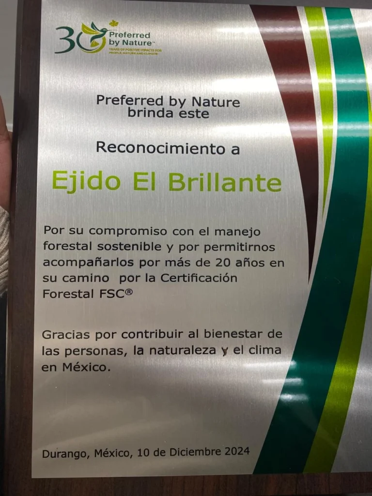 Ejido El Brillante cuenta con una Certificación FSC, por la aplicación de buenas prácticas en la parte social, ambiental y socioeconómica, otorgado por FSC a través de la entidad de verificación Preferred by NatureTM la cual confirma que el sistema de Gestión Forestal y Cadena de Custodia de Ejido el Brillante
